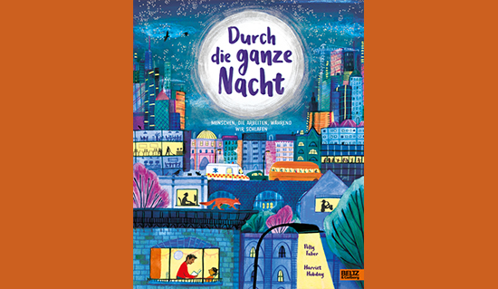 »Es wird dunkel. Ich habe zu Abend gegessen. Ich habe Zähne geputzt und meinen Schlafanzug angezogen. Meine Mama hat gerade gefrühstückt. Sie hat sich die Haare gekämmt und ihren Mantel angezogen.« Mit diesen Worten beginnt »Durch die ganze Nacht«, sie markieren die Rahmenhandlung, die die folgenden kurzen Geschichten über Menschen und ihre Berufe zusammenhält. Im Gegensatz zur Ich-Erzählerin sind diese Frauen und Männer, die eine kulturelle Vielfalt repräsentieren, nicht namenlos. Und sie haben Berufe, die ausschließlich oder jedenfalls auch in der Nacht ausgeführt werden müssen. Die großflächigen bunten Bilder werden nicht von der Dunkelheit der Nacht bestimmt, sondern von farbenprächtigen Häusern, erleuchteten Fenstern und hellen Straßenlaternen. Es sind freundliche Bilder, die Ruhe und Gemütlichkeit ausstrahlen. Sie zeigen die Kehrseite der untertags lauten und hektischen Stadt. Daran dass das Leben auch dann weitergeht, wenn die kleinen BetrachterInnen des Buches sich abends ins Bett legen und ihre Augen schließen, haben sie vielleicht noch gar nicht gedacht. Umso schöner, dass den Menschen, die nachts ihren Berufen nachgehen, hier eine Bühne gegeben wird.
